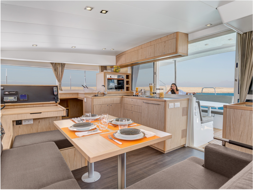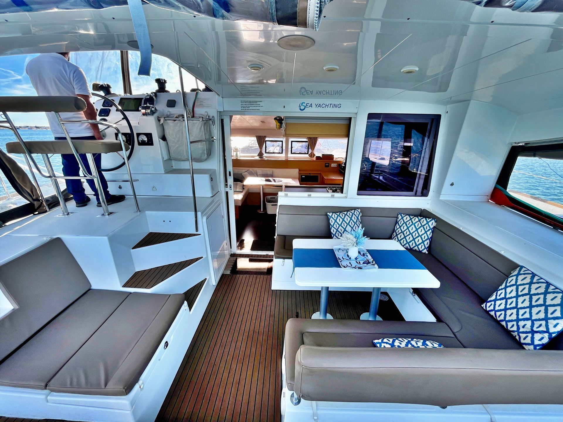 Designed for comfort and social cruising, iSea One welcomes up to 16 guests on board. The wide beam of the catamaran creates generous deck space, including a sun deck, swim platform, shaded seating under the Bimini, and comfortable deck furniture for enjoying the scenery. Guests can relax, swim, or simply take in the peaceful surroundings of this remarkable natural park.