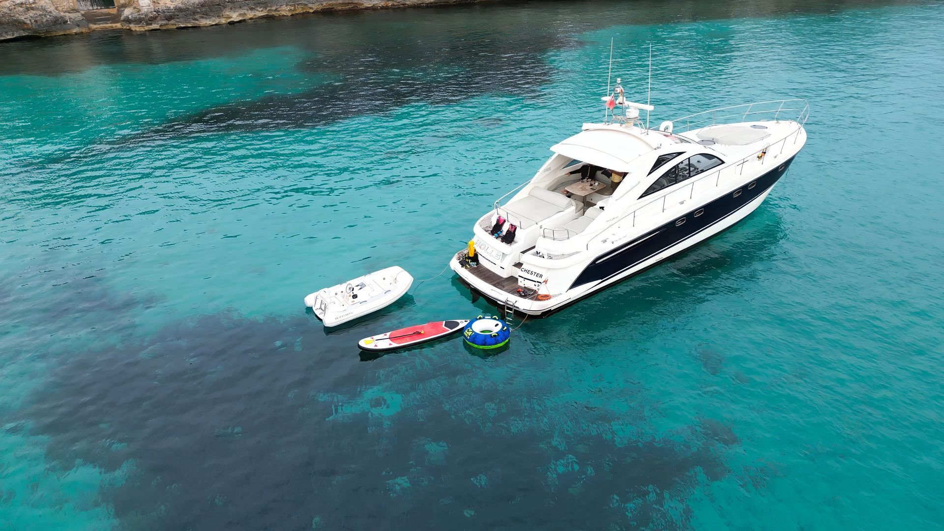 Our crew are passionate about offering a truly memorable experience on all of our boat charterers on Holls. The Fairline Targa 52 GT is a classic. The sharp sweeping lines ensure a smooth ride and efficiency. An inviting swim platform and sun-drenched cockpit make the Targa 52 a perfect boat for splashing around in the sea before catching the suns rays.