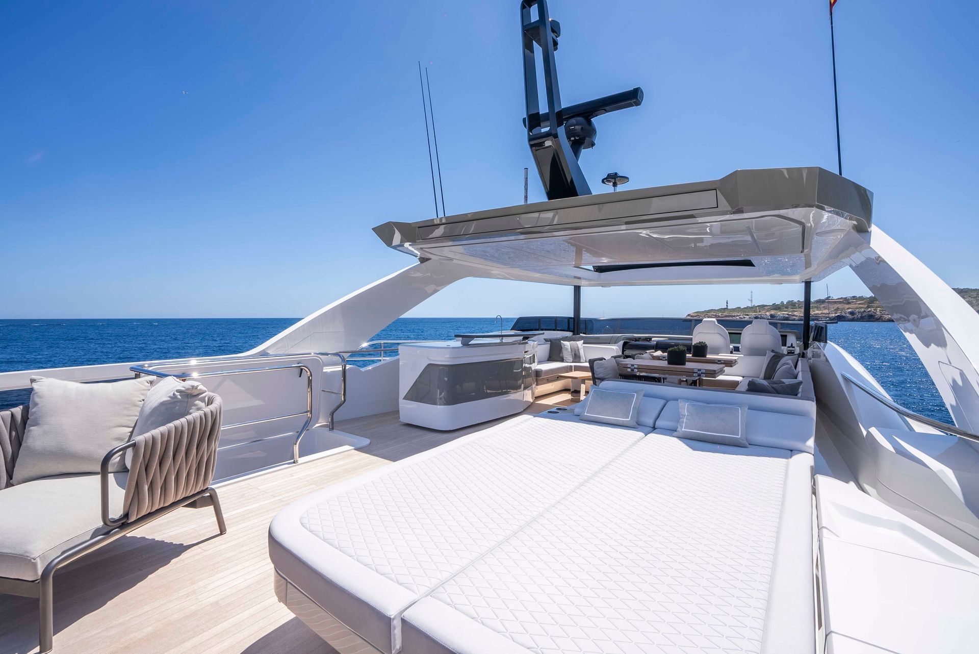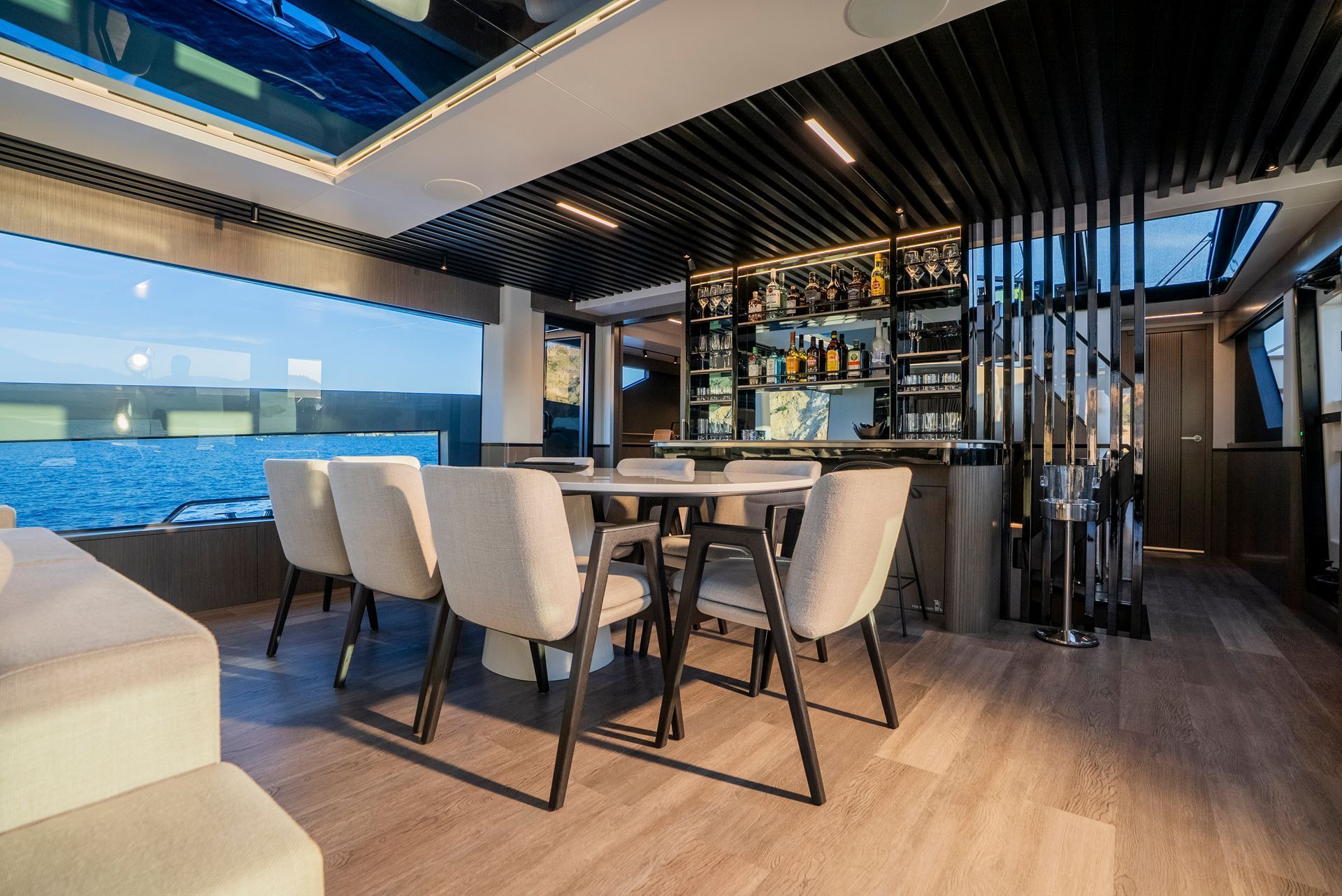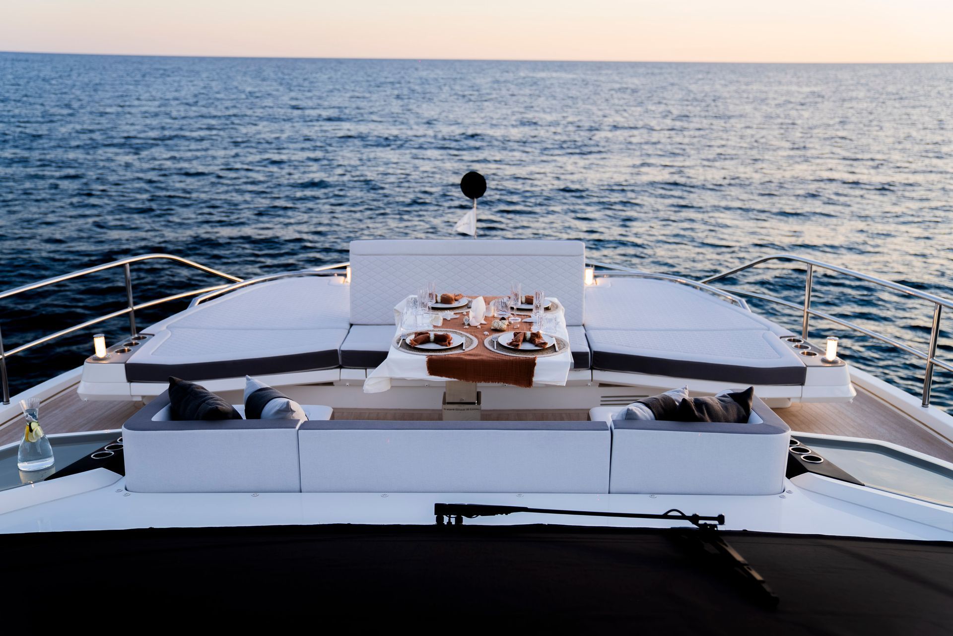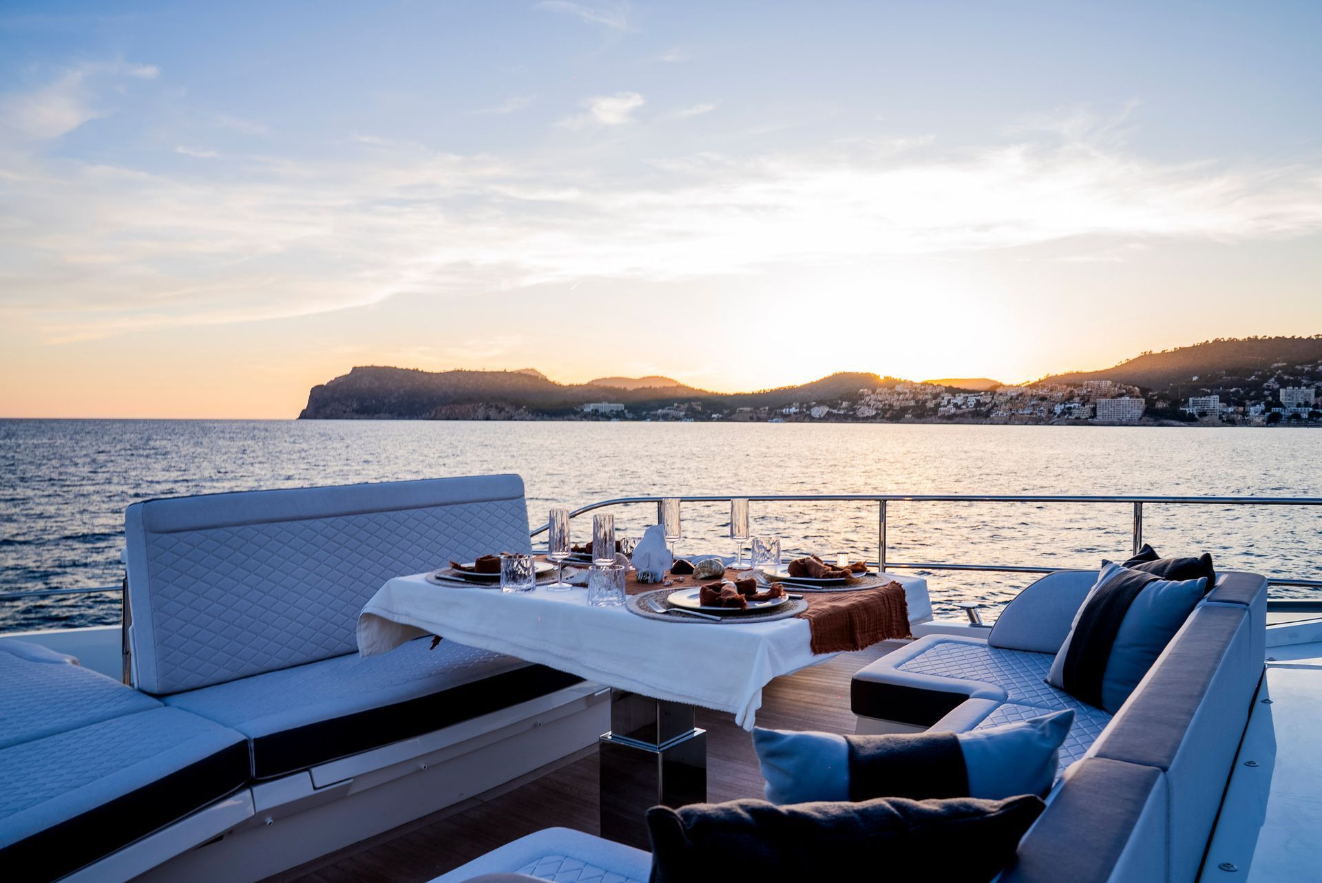 Onboard, you'll find beautifully appointed lounging areas, an open-plan saloon with floor-to-ceiling windows, and multiple sunbeds where you can stretch out and soak in the Mediterranean sun.