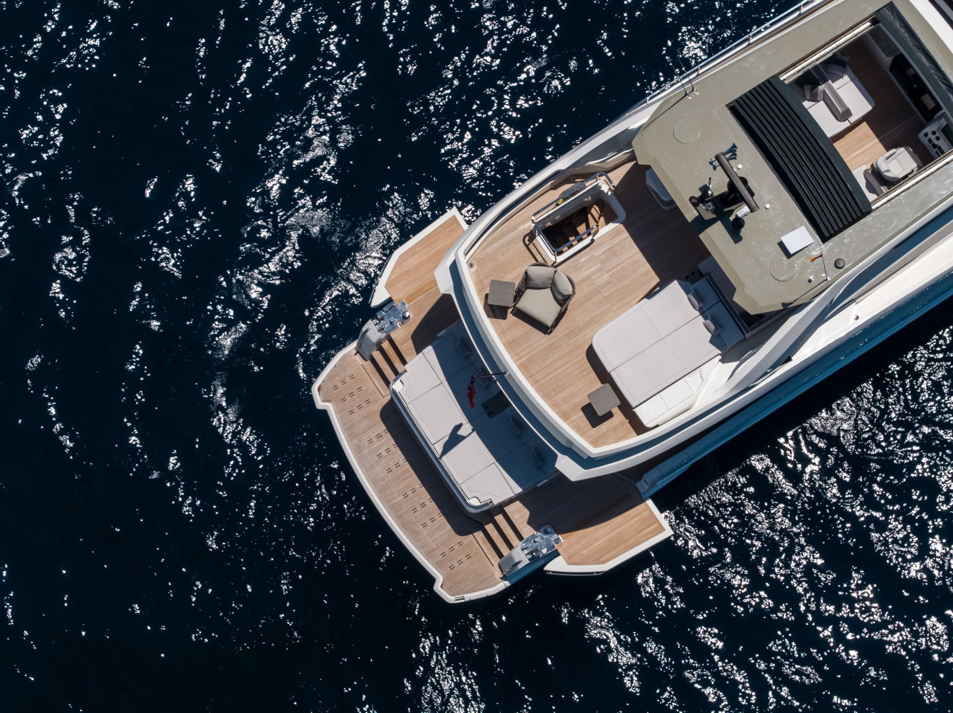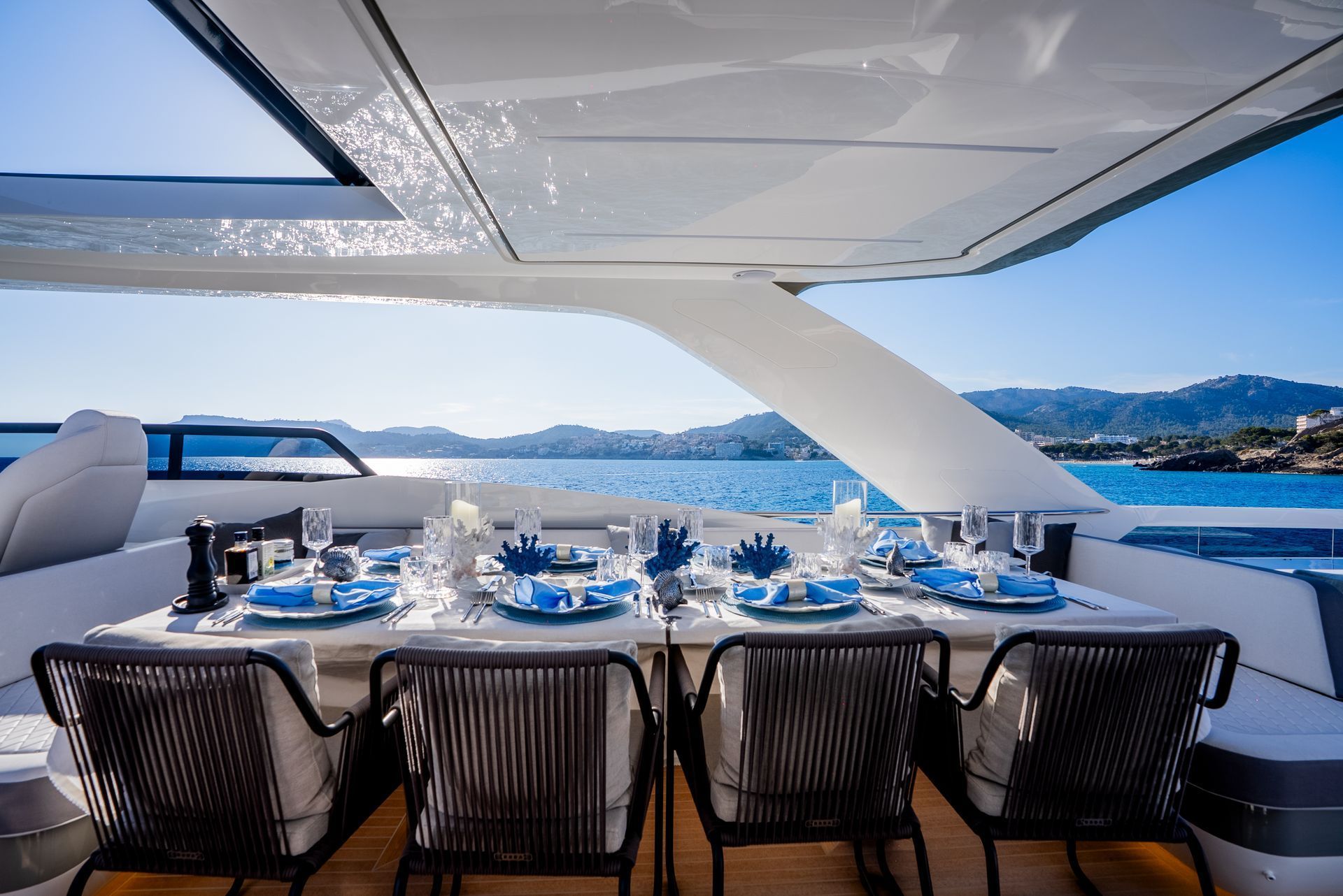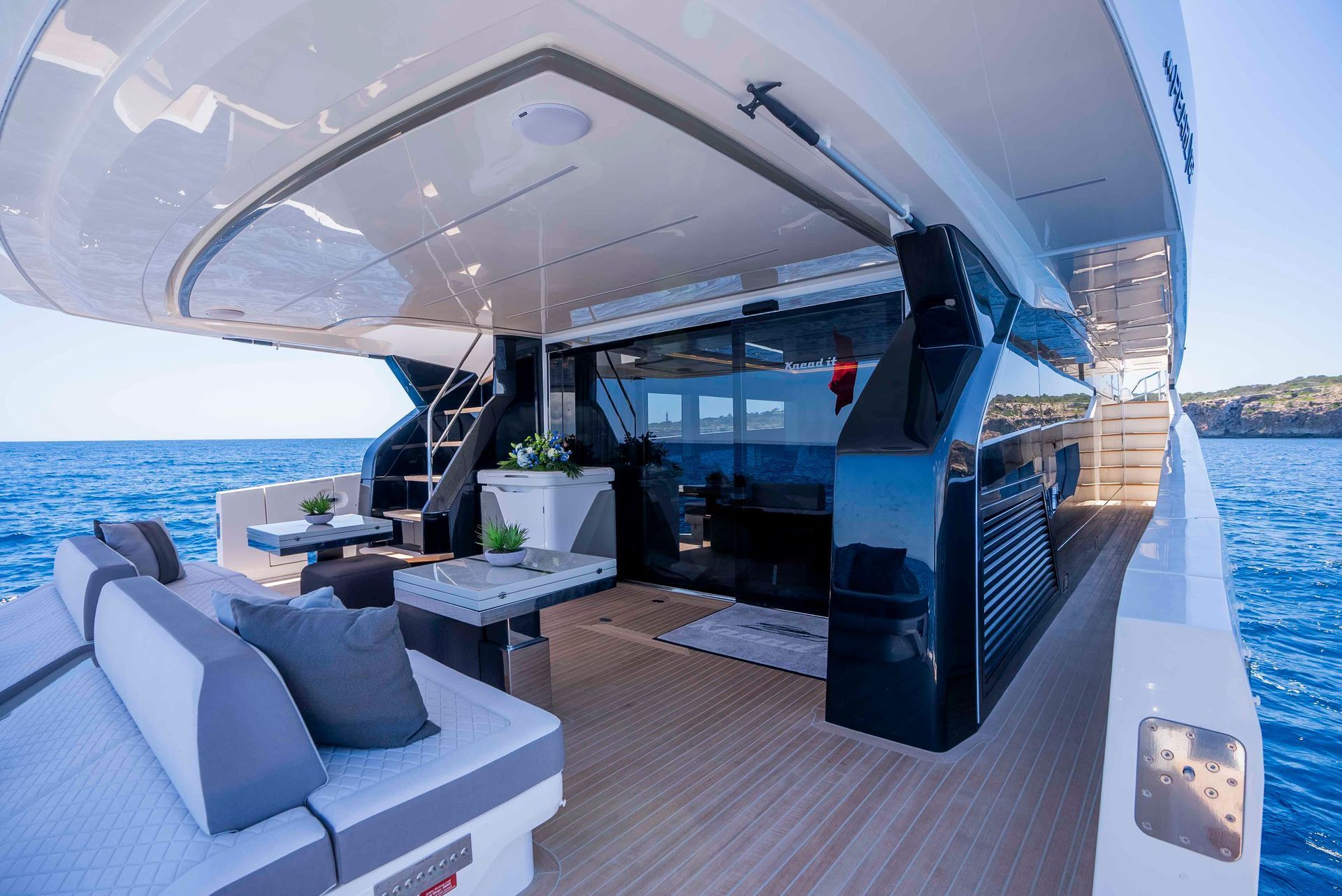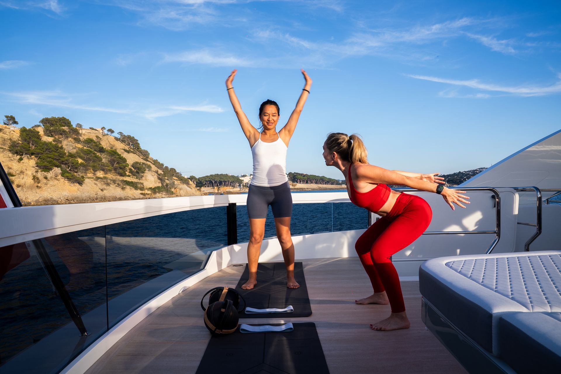 Onboard, you'll find beautifully appointed lounging areas, an open-plan saloon with floor-to-ceiling windows, and multiple sunbeds where you can stretch out and soak in the Mediterranean sun.