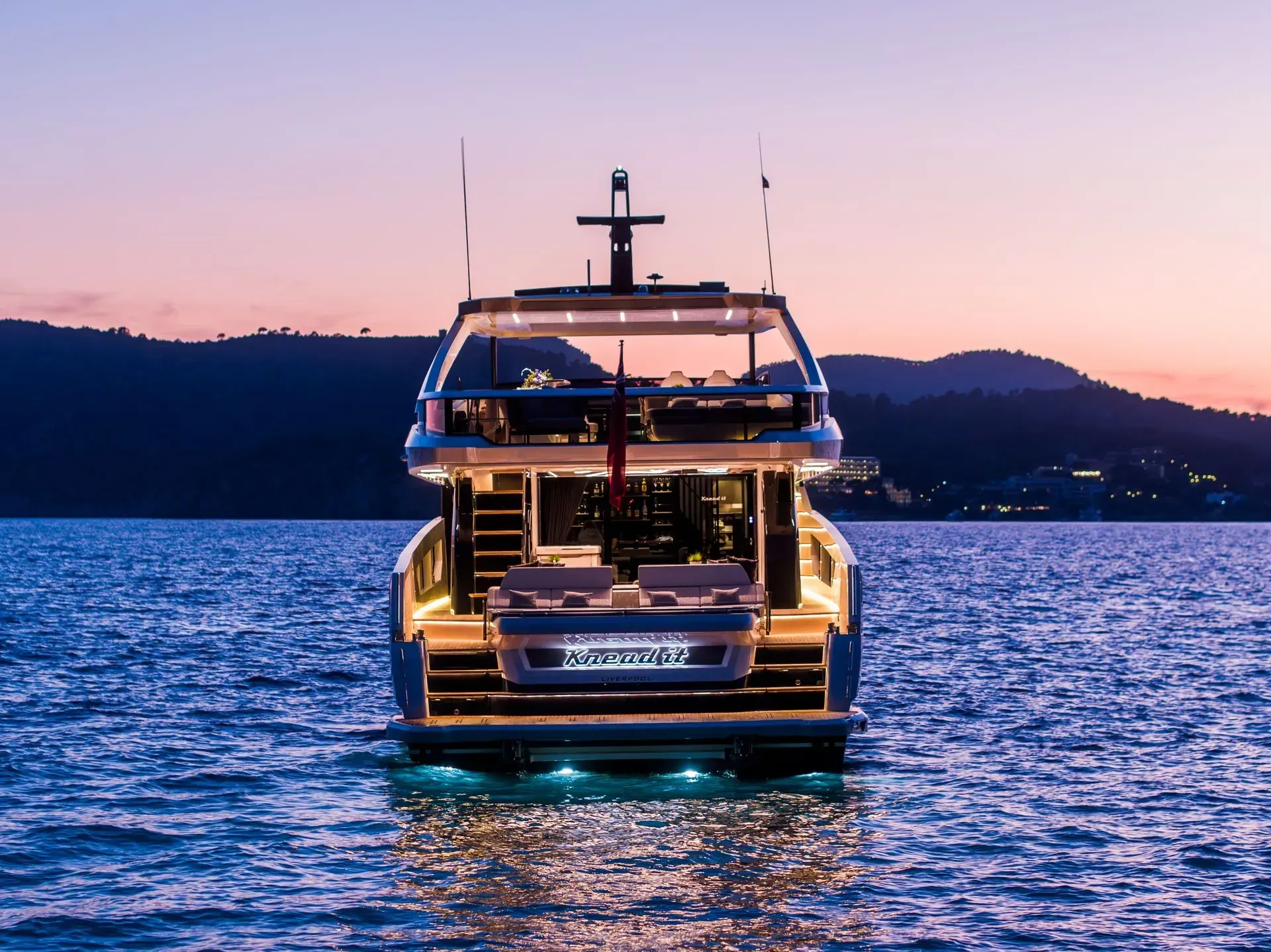 The yacht also features a fully equipped galley, spacious cabins, and a stylish flybridge perfect for cocktails at sunset or a laid-back lunch at anchor.