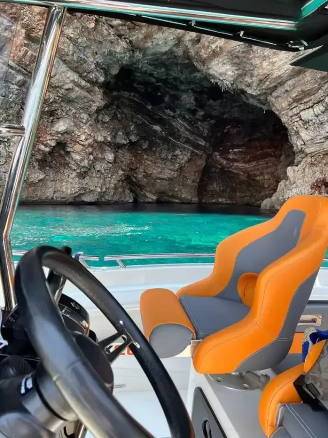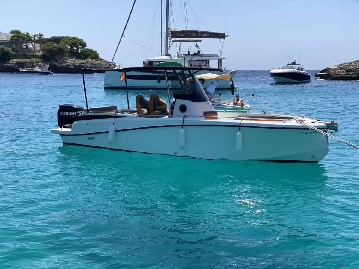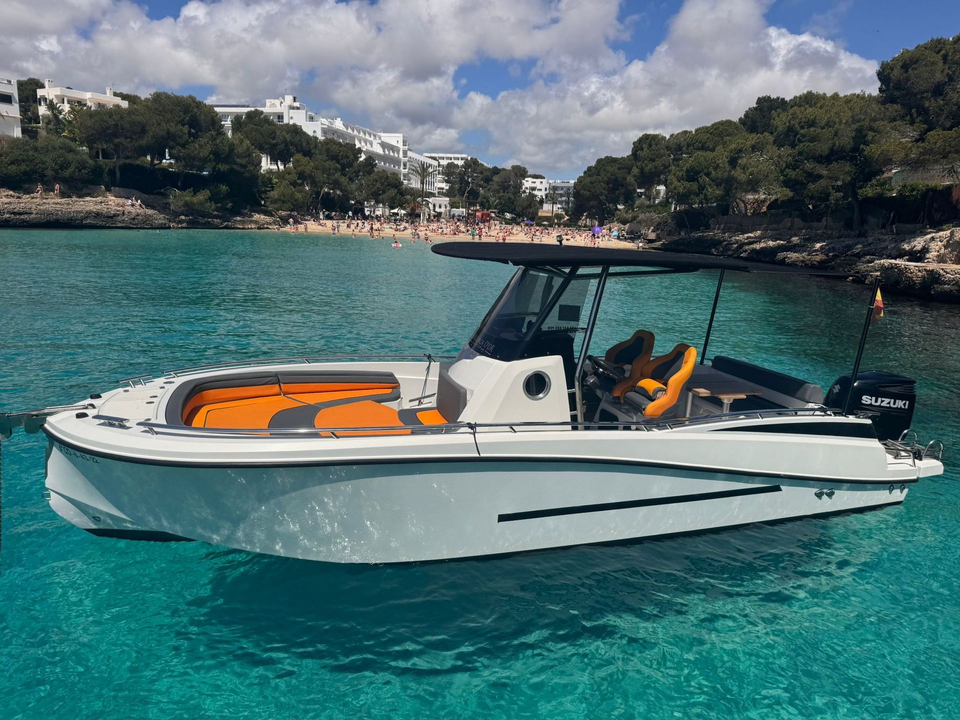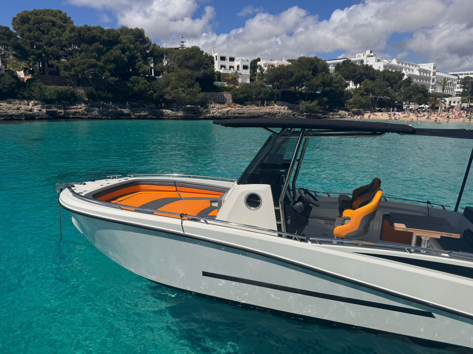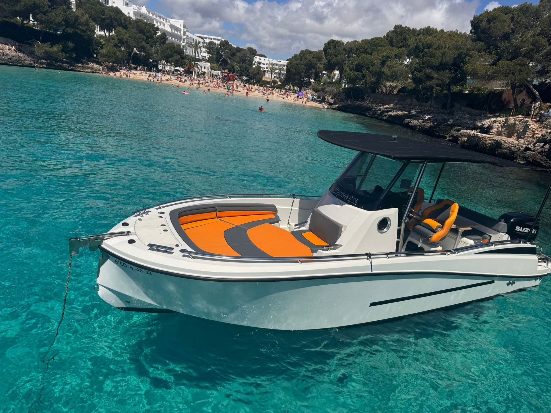 Fast, fun, and built to impress — The Mafius is a sleek, sporty boat made for those who like a bit of power with their paradise. With a 300 hp engine, room for 11 guests and an onboard bathroom, she’s the perfect mix of performance and comfort. Explore Mallorca’s rugged coastline, stop at stunning beaches like Cala Mondragó or Cala Esmeralda, and enjoy an unforgettable day on the water.