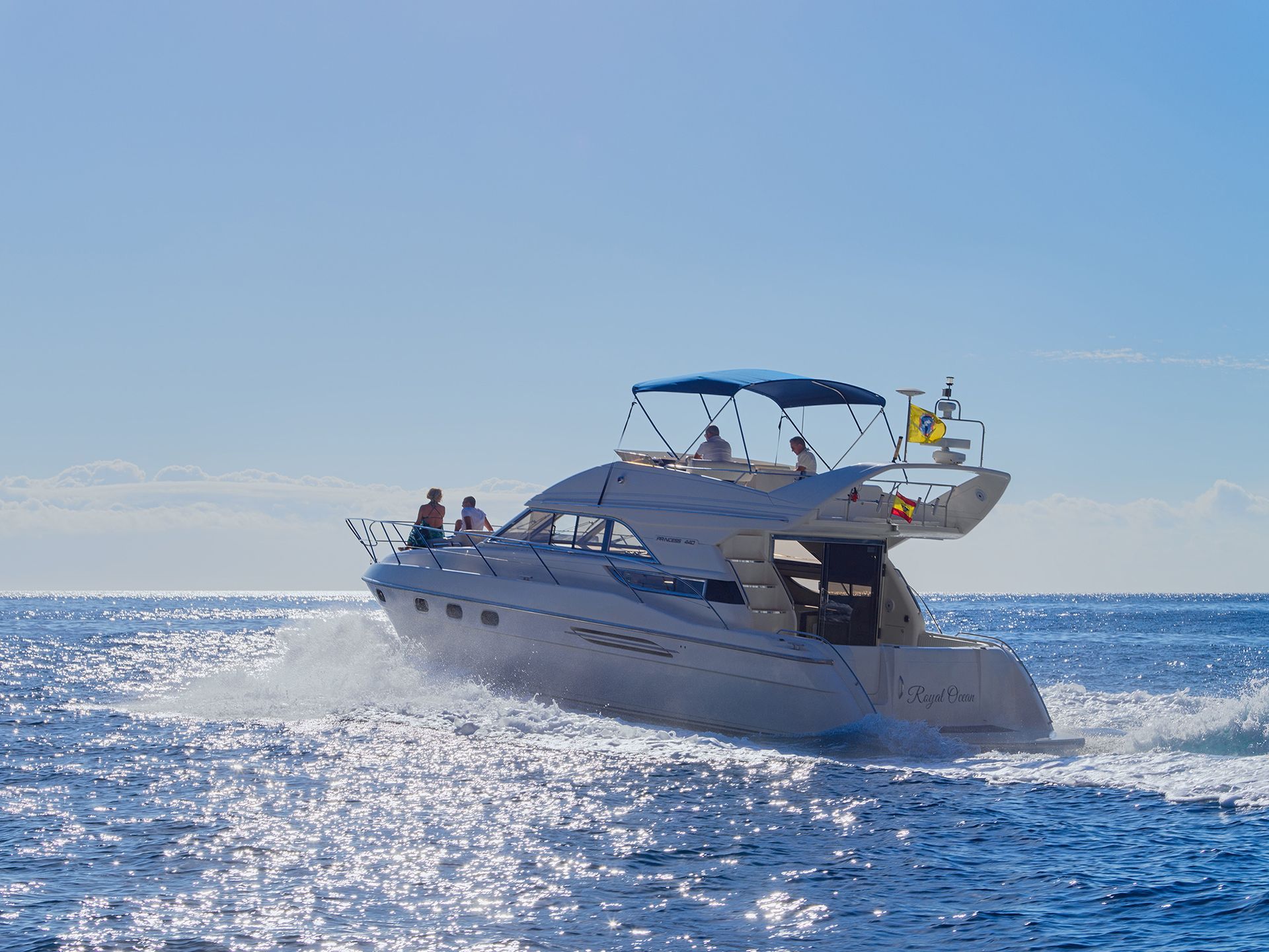 Set out to explore the waters of Tenerife aboard Motor Yacht Royal Ocean, departing from Marina de Las Galletas on the island’s sunny southern coast. This comfortable yacht features three cabins, a welcoming saloon, and a fully equipped kitchen, along with generous outdoor spaces designed for relaxing while enjoying the Atlantic Ocean and Tenerife’s striking coastal scenery.