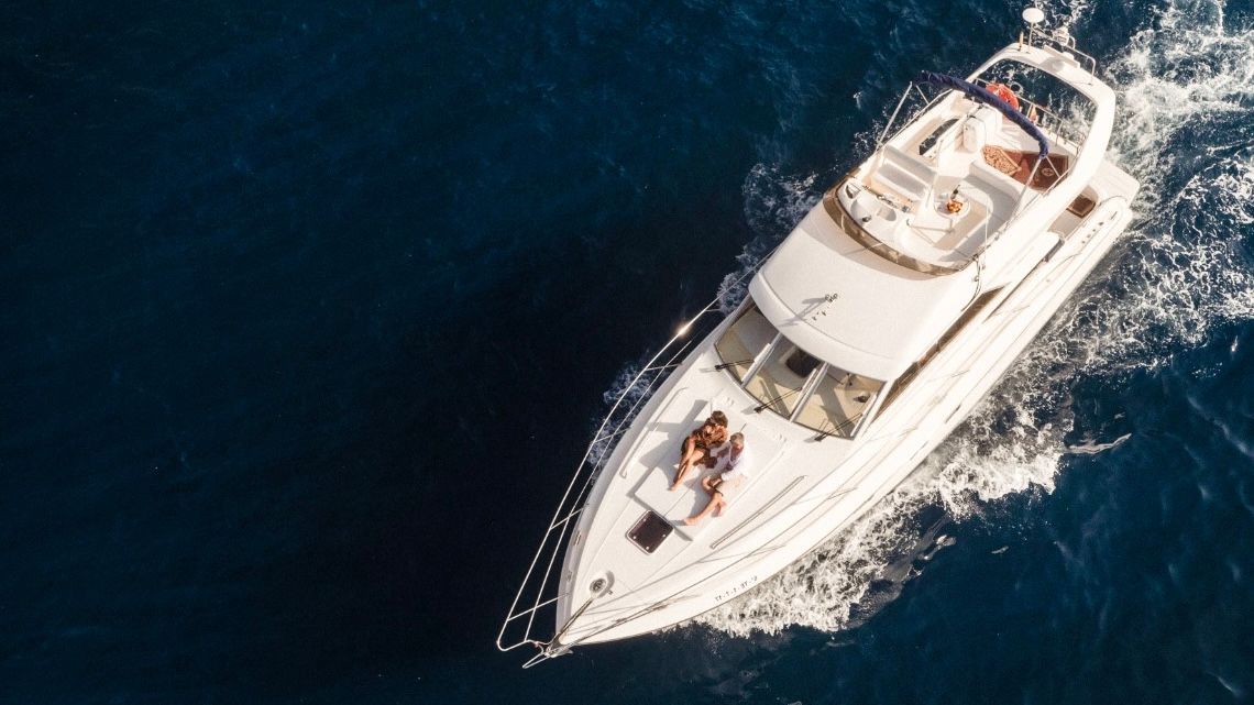 Guests can unwind in the spacious seating area at the stern, relax on the sunbathing area at the bow, or head up to the flybridge, an open rooftop deck ideal for soaking up the sun or enjoying the sea breeze under the awning while taking in views of the surrounding coastline.